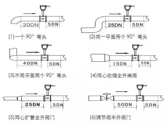 傳感器的管道軸心應(yīng)與相鄰管道軸心對(duì)準(zhǔn),連接密封用的墊圈不得深入管道內(nèi)腔。不同情況下的直管段要求如下圖。