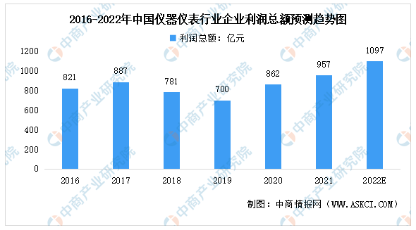 其增長速度整體而言高于主營收入的增長速度,說明我國儀器儀表行業(yè)的盈利能力不斷提升,已步入高質(zhì)量發(fā)展階段。中商產(chǎn)業(yè)研究院預(yù)測,2022年我國儀器儀表行業(yè)企業(yè)利潤總額將達(dá)1097億元。