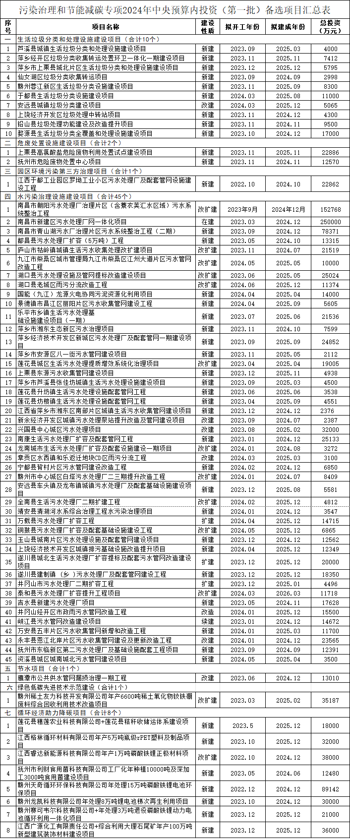 江西省發(fā)展改革委關(guān)于污染治理和節(jié)能減碳專項2024年中央預(yù)算內(nèi)投資(第一批)備選項目的公示,經(jīng)初審、第三方組織專家評審、行業(yè)部門聯(lián)審,擬推薦備選項目68個,包含生活垃圾分類和處理設(shè)施建設(shè)項目(合計10個),危廢處置設(shè)施建設(shè)項目(合計2個),園區(qū)環(huán)境污染第三方治理項目(合計1個),水污染治理設(shè)施建設(shè)項目(合計45個),節(jié)水項目(合計1個),綠色低碳先進技術(shù)示范建設(shè)(合計1個),循環(huán)經(jīng)濟助力降碳項目(合計8個)。
