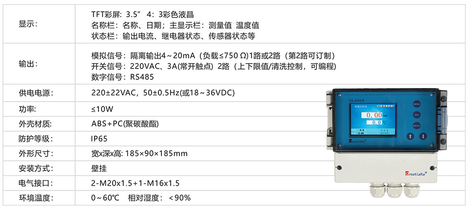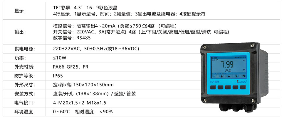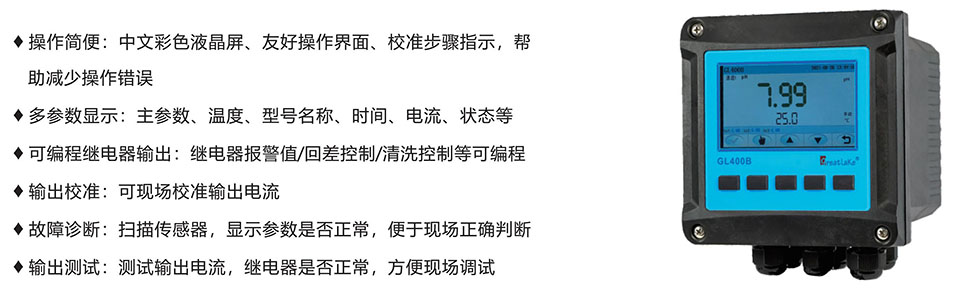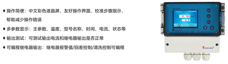產(chǎn)品簡(jiǎn)介: 智能分析儀GL400A他的功能特點(diǎn)有:中文彩色液晶屏、友好操作界面、校準(zhǔn)步驟指示,幫助減少操作錯(cuò)誤;主參數(shù)、溫度、型號(hào)名稱、時(shí)間、電流、狀態(tài)等;可測(cè)試輸出電流和繼電器輸出是否正常;繼電器報(bào)警值/回差控制/清洗控制可編程